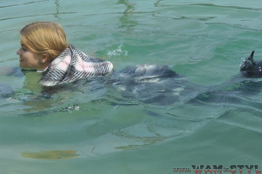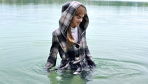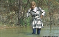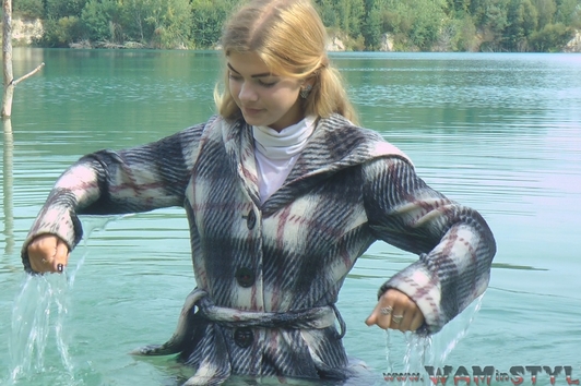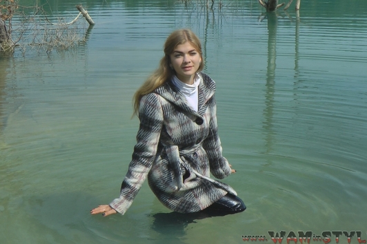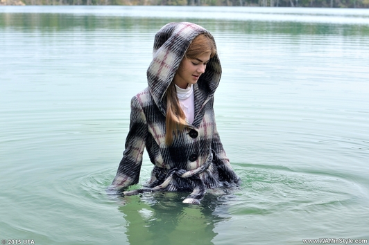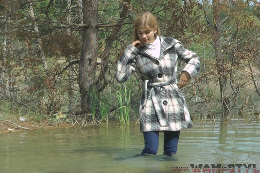 This time Marianna was dressed warm, for swimming, as the water was cool. The girl went into the water wearing boots, jeans, waistcoat. First she sat down and got wet to the waist, then she lay down and soaked completely. At the end Marianna removed boots and vest, showing us a wet T-shirt and blue socks on her feet.