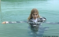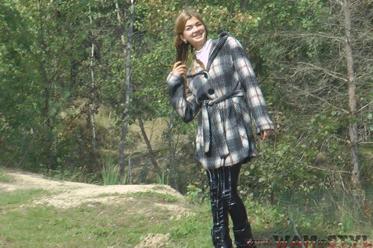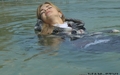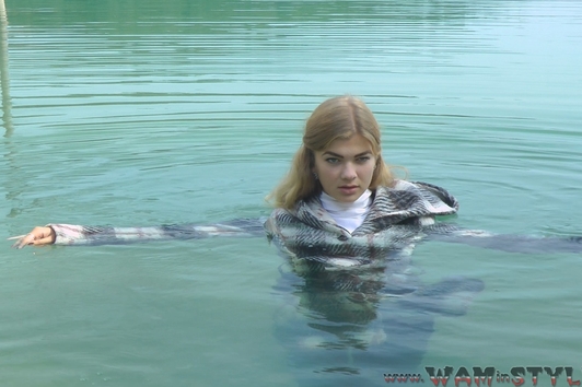 Victoria in her boots, winter coat and jeans comes into the water and swims fully clothed. Beautiful girl poses under submerged tree, takes off her coat, shows us sheer white wet shirt on her beautiful body, removes the boots and we see that under jeans girl wears light brown nylon tights.