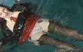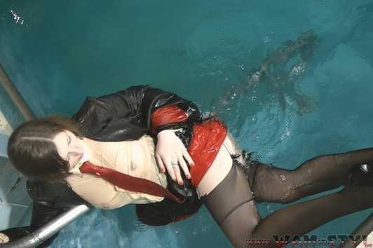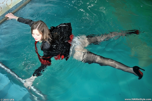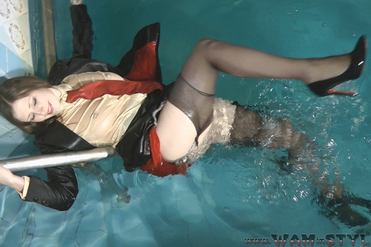 Elena swims in the pool in her most expensive business suit, she also wears black stockings with suspender and high heels shoes. When Elena is completely wet, you can see her beautiful body through the wet satin blouse.