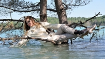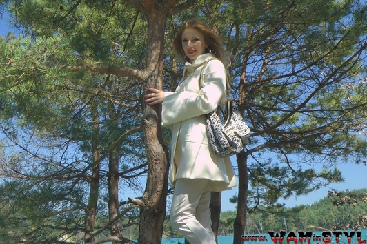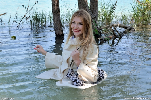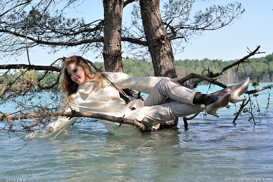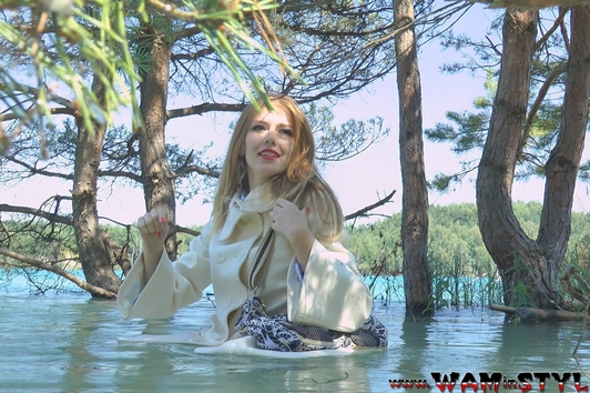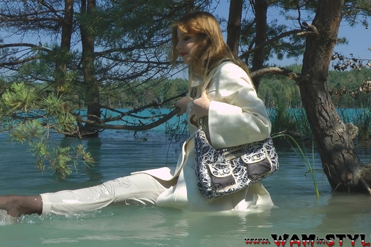 Nika in elegant white coat and trousers gets wet in the lake fully clothed. She also wears shirt, black stockings and high heel shoes under coat.