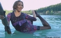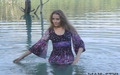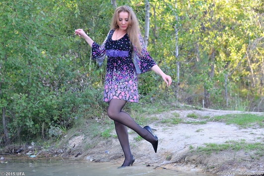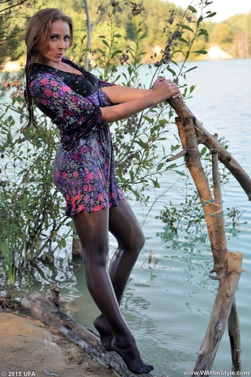 Bonya in a dress and stockings bathes in a lake.