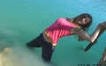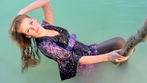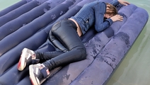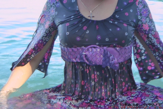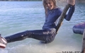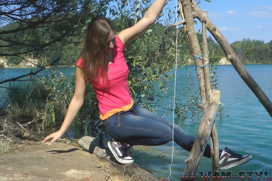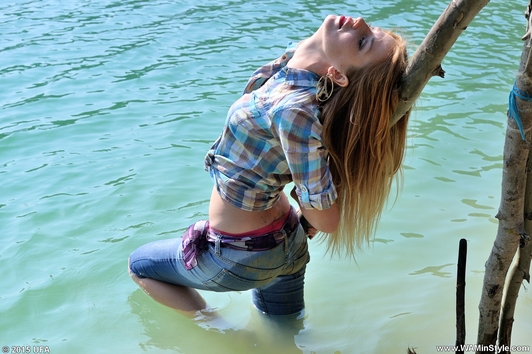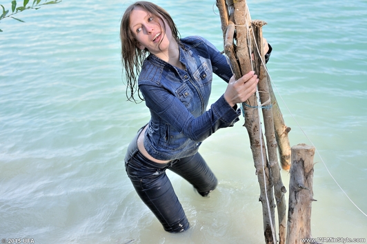 In a nice hot summer day Elena relaxes in the lake, she gets wet fully dressed in her favorite jeans and a red t-shirt, braless. Girl is dancing striptease with the music right in the water near the makeshift wooden pole. Elena all wet, dressed and looks much sexier than a nude girl. When Elena got a little tired and felt cold, she dressed a denim jacket and decided to take a rest right in the water, on an inflatable mattress.