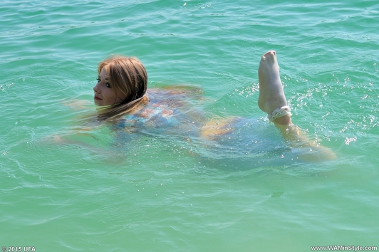 Nika prefers to swim in the summer in the same clothes as she wears- shirt, denim shorts and white socks with high heel shoes. Why to carry a swimsuit when it is so hot? It is better to get wet not undressing, and to enjoy the coolness of drying clothes on the body for a long time.