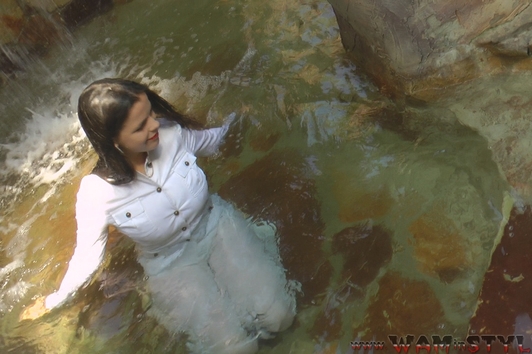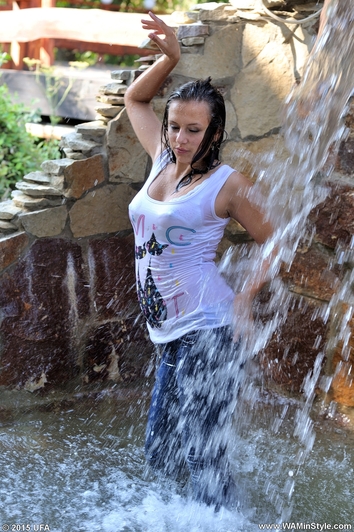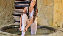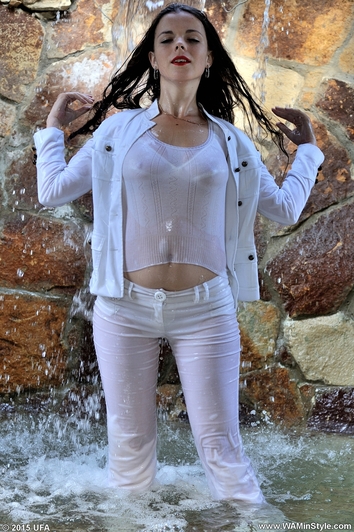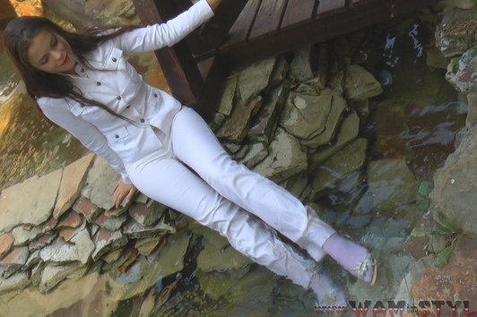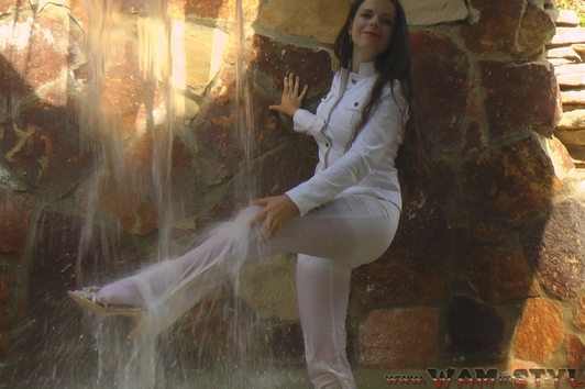 Greta in a beautiful pantsuit goes into the water of artificial waterfall. Girl gets wet fully clothed under cold jets of waterfall, then goes to worm up in the hot bowl, posing at the camera, showing a very sexy wet T-shirt and feet in wet white socks.