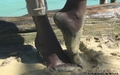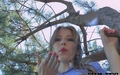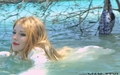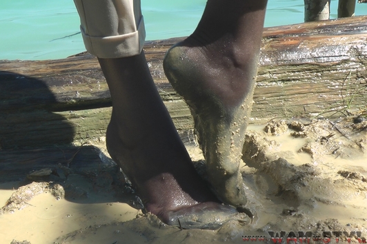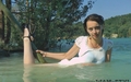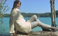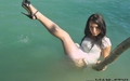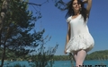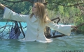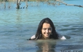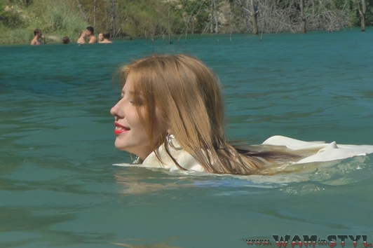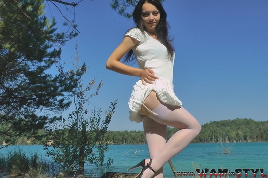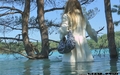 Margaret poses and bathes in the lake fully clothed, in a short white dress, stockings and high heel sandals.