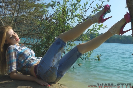 Elena in jeans shows a striptease in the lake.