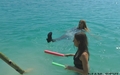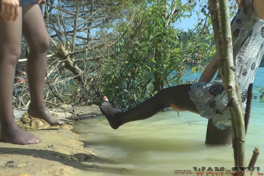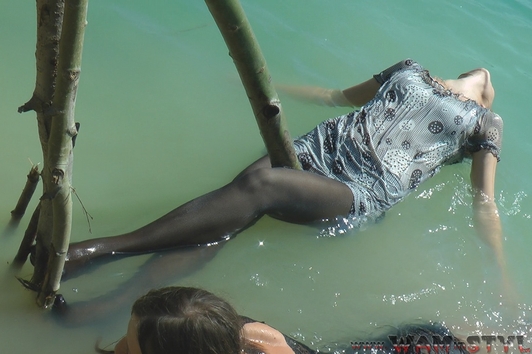 Elena and Nika found an interesting wet fun, they dressed nice short dresses with stockings and high heels and had a water fight with the "Jedi swords" shooting water. Gradually, the game moved from the shores to the lake water, where girls swam enough undressing and taking off only shoes. And at the end the girls staged a wet dance in spite of admiring glances of other resting, not being embarrassed of their sexual wet views - wetlook!