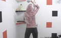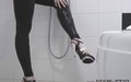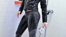 Irma decided to take a shower fully clothed. The girl went into the shower wearing black leggings, nylon socks, high heel sandals, blouse and jacket. Irma took a relaxing shower, washed her leggings right on herself, towel off her wet clothed body.