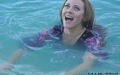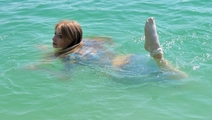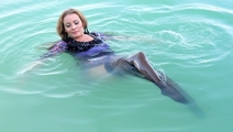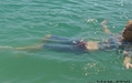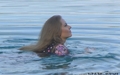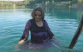 Nika swims in the lake fully clothed.