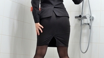 Elena decided to relax after office work in original way - to take a bath fully clothed, in her best business suit (jacket with a short skirt), in black tights and a classic high-heeled shoes. At the end she took off her jacket and skirt and showed us wet teddy and tights looking very erotic and sexy!