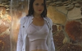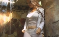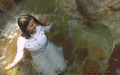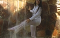 Greta in white suit gets wet under the waterfall.