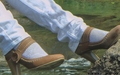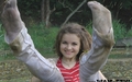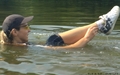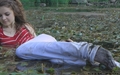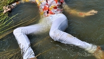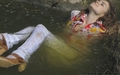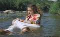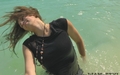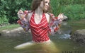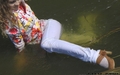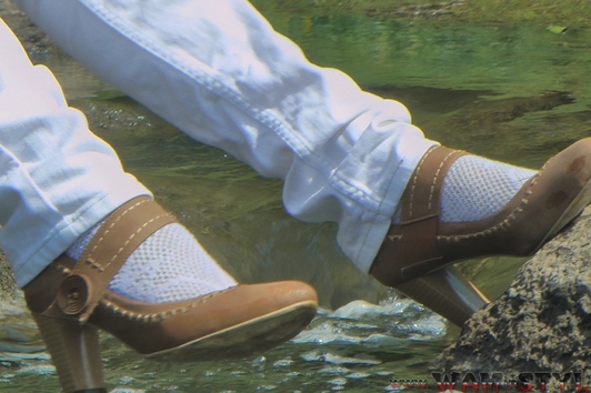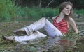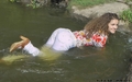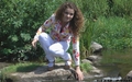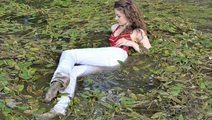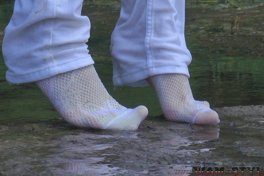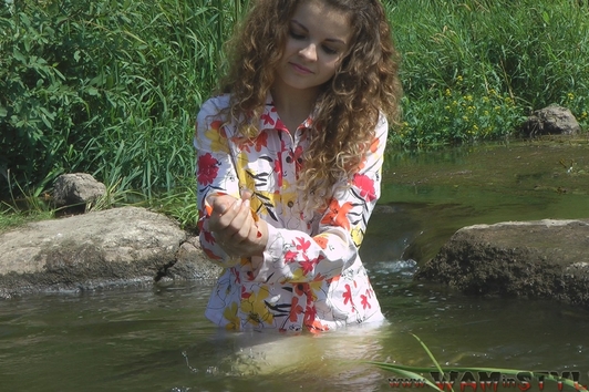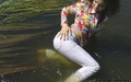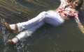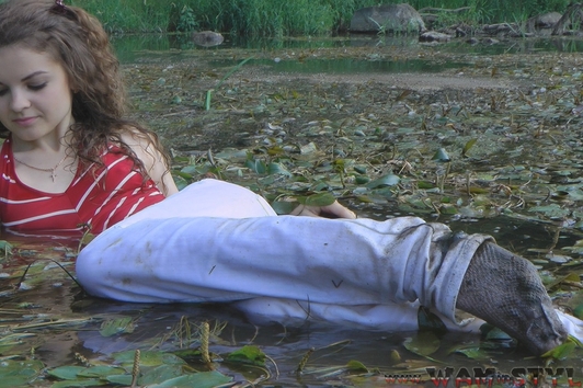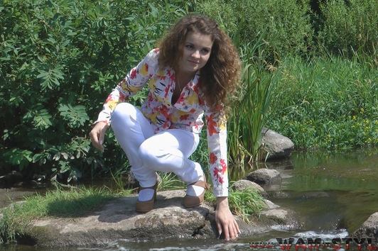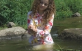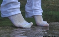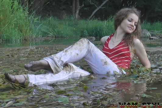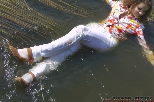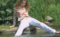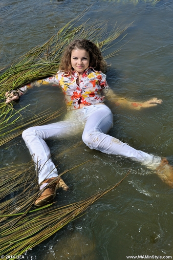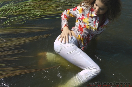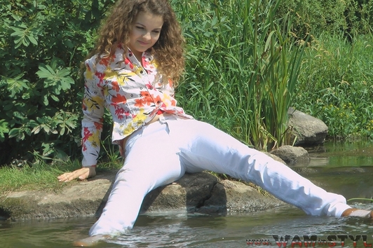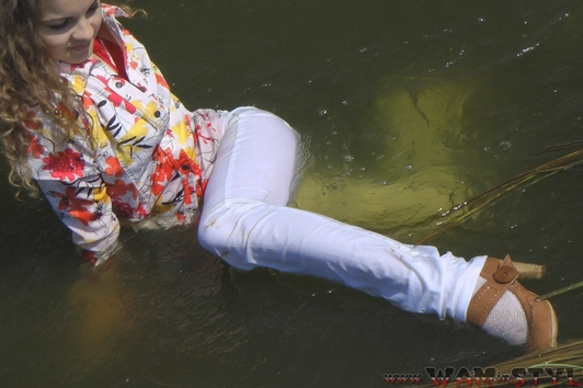 Vanessa gets wet in the cool water in the river fully clothed, wearing white pants, white socks, sandals and nice colored shirt. At the end girl poses in the river weed where her white pants and socks get dirty.