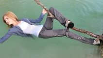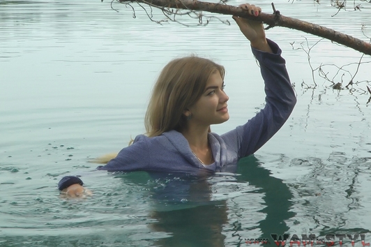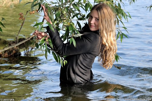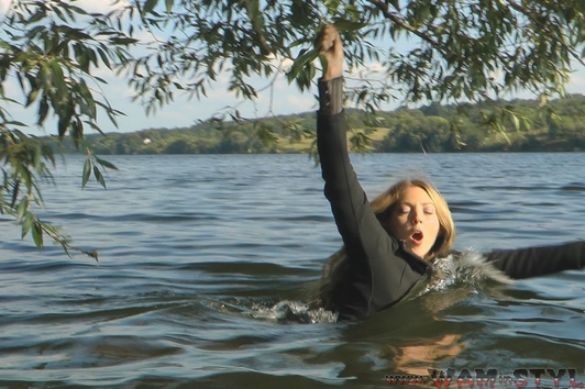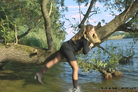 Varvara walked in the forest along the river bank and saw a beautiful tree hanging over the water. The girl decided to arrange a photo session on the tree, but she was unable to keep her balance and fell into the water. Boots and tights immediately soaked, but it put Varvara on her mettle and photo session turned into a real wetlook session, she has not regretted her coat and started swimming).