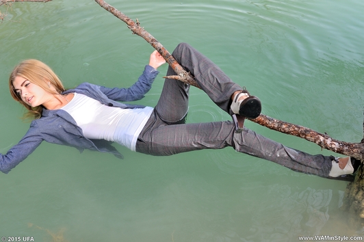 Victoria in elegant pantsuit comes into quiet water of cool lake. The girl did not even take off her shoes, so she submerged into the water fully clothed, enjoying soaking in wet clothes.