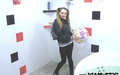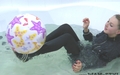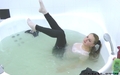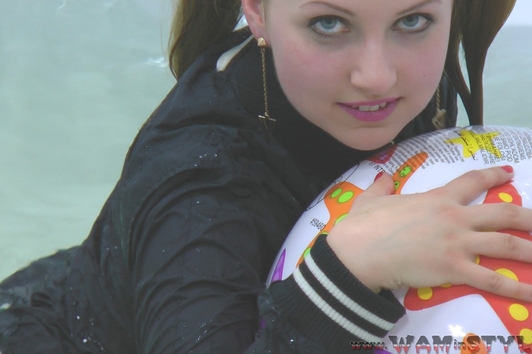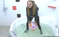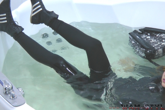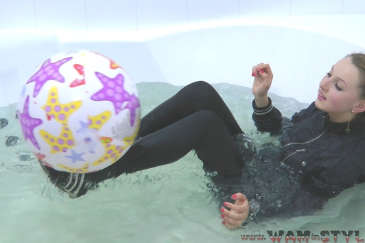 Marianna was playing ball in the bathroom, then the ball fell into tub full of water. Girl went into the water fully clothed, even forgetting to take off her backpack. Water quickly penetrated her shoes and got her feet in white socks wet, then Marianna in leggings and jacket totally submerged and continued to play and to enjoy the feeling of wet clothes.