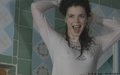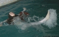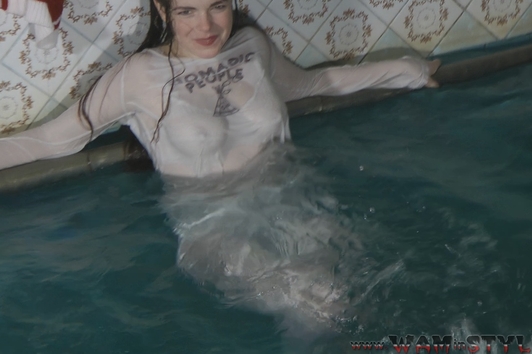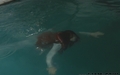Greta swims in the pool fully clothed.