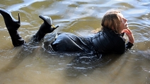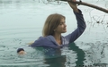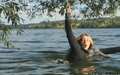 Victoria in a business suit swims in the lake.