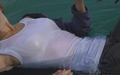 Vanessa in the business brown trouser suit bathes and dives in the pool. She also wears nylon light socks and shoes and black sleeveless blouse under jacket.