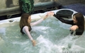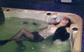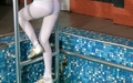 Marianna was playing ball in the bathroom, then the ball fell into tub full of water. Girl went into the water fully clothed, even forgetting to take off her backpack. Water quickly penetrated her shoes and got her feet in white socks wet, then Marianna in leggings and jacket totally submerged and continued to play and to enjoy the feeling of wet clothes.