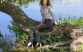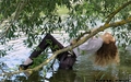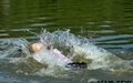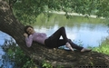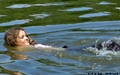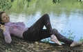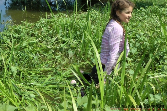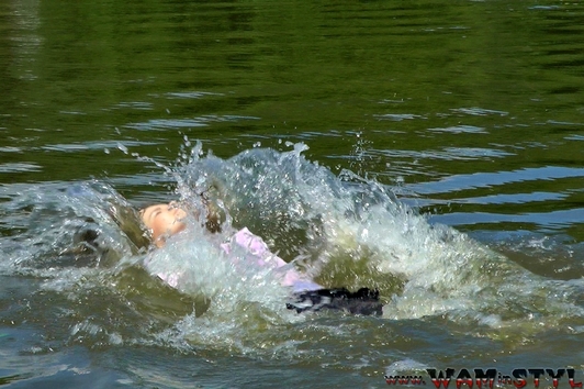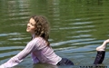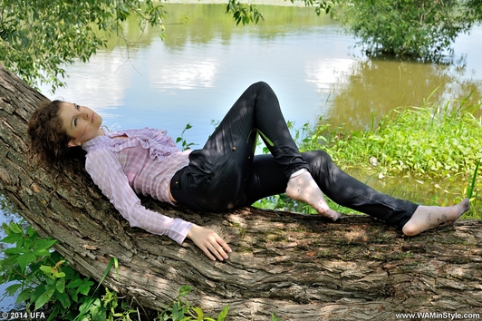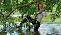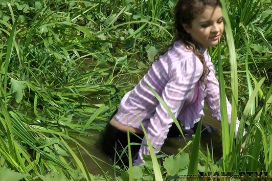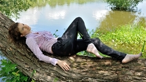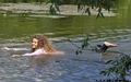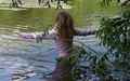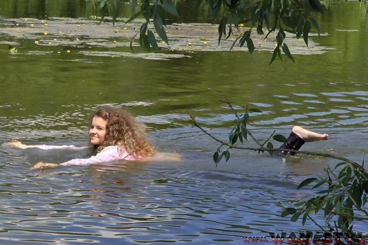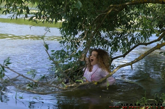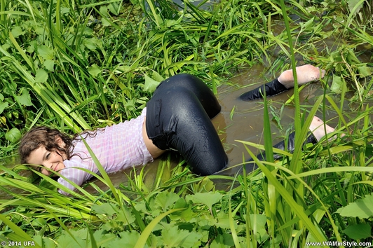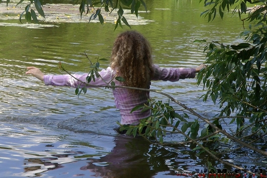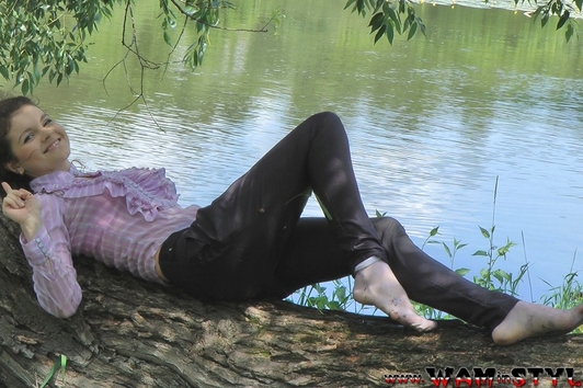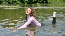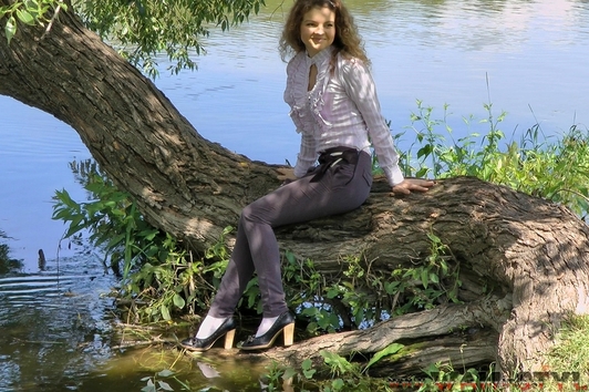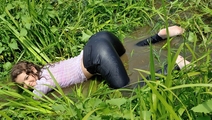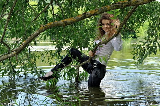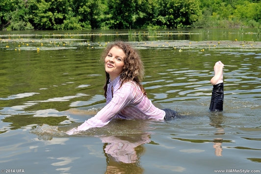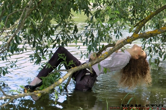 It's very nice to dip into the cool water after a sweltering workday in a hot summer day. After working in hot office Vanessa came to the river, right in her working clothes. Leisurely girl entered the water, in shoes, white socks, office trousers and dressy white blouse. Vanessa came gradually deeper into the water and finally immersed herself and swam in the river.
