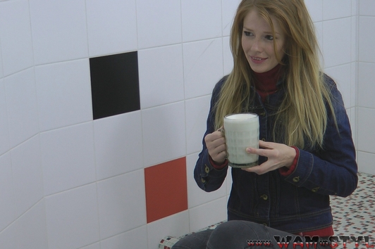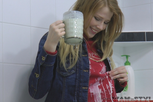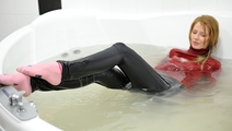 Marianna decided to test her new coat, how it will protect from the rain. Girl turned on the shower and stood under it fully clothed. Coat helped bad, water penetrated under the clothes and soaked skirt and pantyhose, legs in boots got wet too. The girl used it and decided to take a bath fully clothed, there she began to undress, leaving only white shirt and tights at the end.