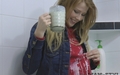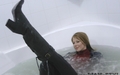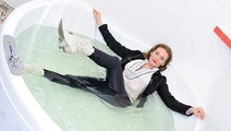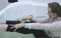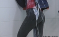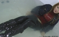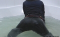 Marianna in coat gets wet under shower and then in jacuzzi.