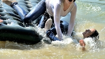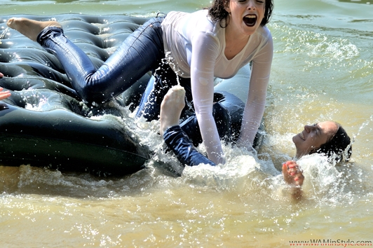 The girls decided to check how different will it feel to have fun on the mattress in full clothes from doing this in swimsuits as usual. They were doing everything on the mattress – standing, sliding, swimming, having all the possible fun. They even forgot they were in clothes. Only the beautiful shine of the wet Levi's jeans and a pleasant feeling of water-soaked clothes made them feel different. At least they took off their bras and left in wet T-shirts seductively displaying their beautiful young breasts. They proved that playing usual water games in clothes is even more cool than in a swimsuit.