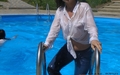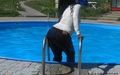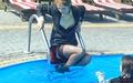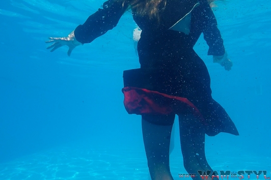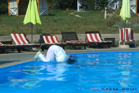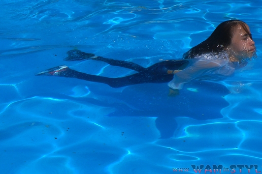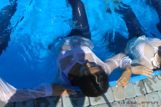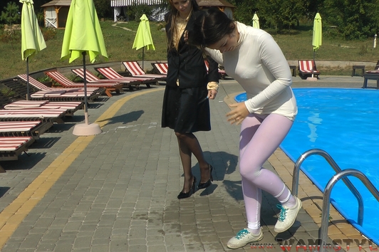 Still, a cold water was a relief for a hot day and Greta joined her friend in the pool. She decided to teach Nika how to dive. Though Greta still came to be the one who dived and swam under the water that day, the two girls had lots of fun. They were bathing each other, playing with water and enjoying their wet outfit on hot bodies. Nika's stockings and Louboutins were washed away from time to time. She had to put the shoes off but she didn't want to take off her wonderful vintage stockings.