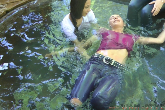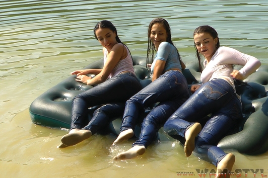 What can be better than a swimsuit? All the wetlook fans know the answer. One day Lola, Ariel and Greta decided that it will be fun to play in water with a matrass. They had dressed Levi's jeans, high heels with white socks and light T-shirts. Greta wore the white one, Ariel the light blue one, and Lola wore atender rosy color. Underneath them each girl wore a bra.