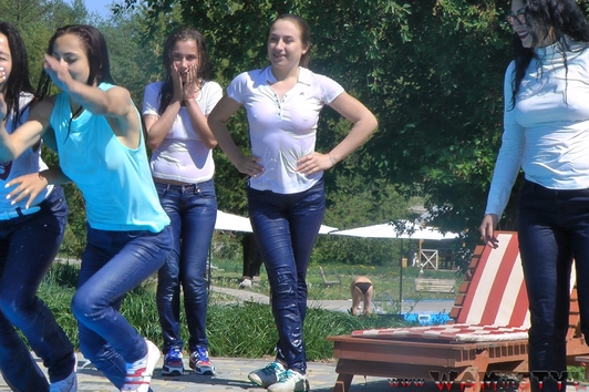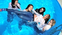 Wanda, Ariel, Sofia, Anita and Nikol met near the pool on an extremely hot day. The girls dressed in white shirts, Levi's jeans and sneakers made a good contrast with Wanda in a black shirt, high heels, black tights and a Levi's skirt. She asked girls questions about the process of getting wet and the details they love about it most.