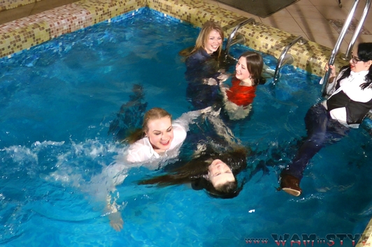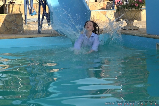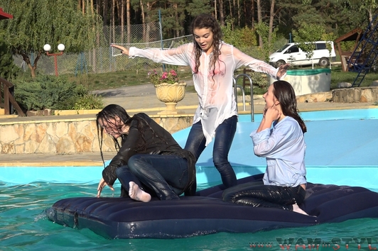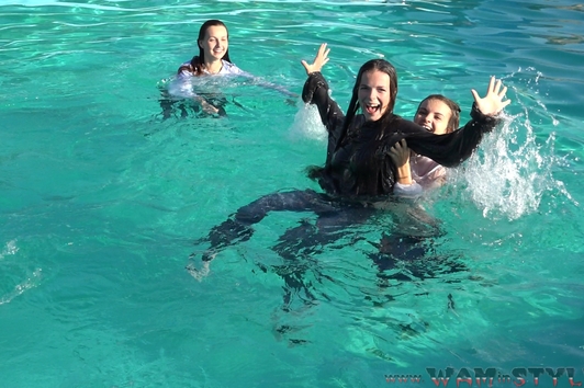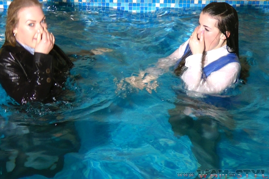 The girls were swimming, diving, holding each other in the water. Their hair and clothes got absolutely wet, their makeup leaked, but it didn't spoil their look, but made it more teasing and adorable. Wet college clothes, drops falling from Kylie's skirt, shiny Greta's ass in pants, tight and heavy with water - what a great vision it was! The girls went out from the pool, showing up their glittery forms in wet outfit, then came back and continued having fun. After it they took off their shoes,showing their lovely feet soaked with water and began to spill the water all over theirselves. So the hot day got an elegant and pleasant ending.