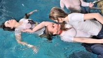Finally girls are together under water jets. They are dancing standing, lying, sitting; soaking more and more wet; getting more joyful and sexy); inviting you to their fun...
