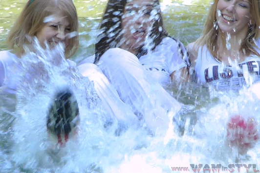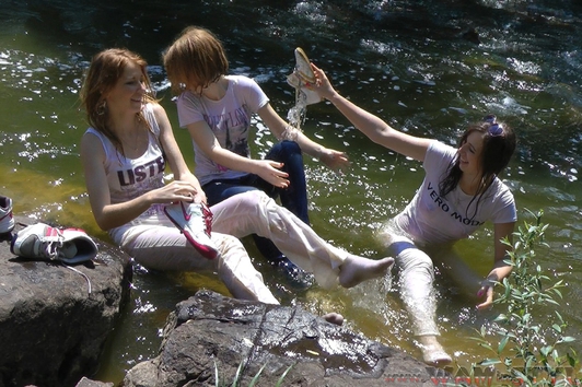 It's high summer heat, outdoor rest, and three best friends Elena, Nika and Natalie decided to have fun. The rapid flow of cool water beckoned the girls to dip and splash a little. Without hesitation girlfriends took a tape recorder, turned up the music louder and went into the water, fully dressed, even wearing shoes. Two girls wear white and blue jeans, Elena wears linen pants, all in summer light T-shirt, sneakers on their feet and white socks. Girlfriends play in the water for a long time, get completely wet and get white clothes stained and having fun with the music, not realizing that camera shoot them, and fully enjoying wetlook!