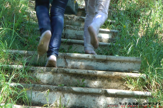 Girlfriends Nika and Natalie work in a serious firm, where they have strict dress code - only business pantsuits. It was very hot summer day, girls decided to sit in the shade near old dam after work, on the shore of a stormy river , to enjoy the coolness after a hard day.