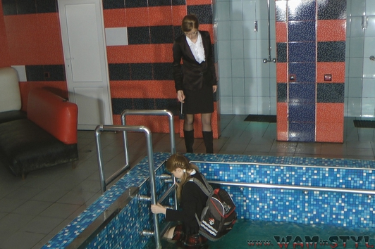 Then Nika made ​​Elena to turn on tape recorder and pass it to Natalia in the pool, so that she could drown it. Once the technique successfully went to the bottom, the teacher made ​​a poor girl to dive under the water and take the phone and tape recorder from the depth. Then Nika allowed Natalia to leave the pool, but only with a very heavy bag full of water and let her take a warm shower to warm up.