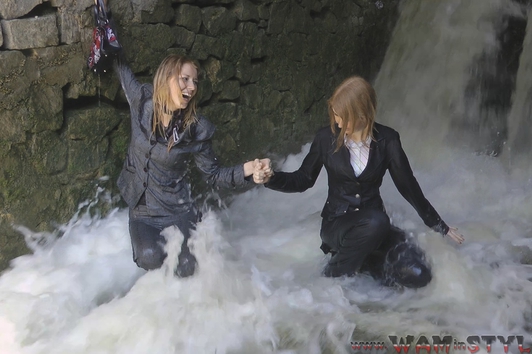 While talking girls didn't notice how their feet in shoes got wet in the cool shallow water, the same for socks. And it gave an impetus to the more mad action - to get wet completely in their business suits, all the more so powerful jets of water from the old dam beckoned to get under it. Without thinking girlfriend dipped into the water , making their way closer to the natural powerful shower.