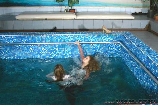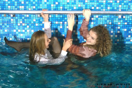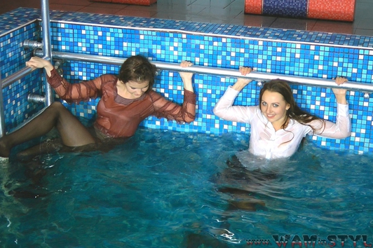 Girlfriends Vanessa and Marianna go to sauna after work in office. Girls drink wine, have fun, pushing each other into the pool, swimming and diving under water. They do all this in their office clothes, elegant blouses, skirts, tights and stockings. After the pool girlfriends go out of the water, showing off their beautiful legs in wet nylon, take on high heel shoes and go under warm shower, where they have pleasure again under warm jets of water, fully clothed.