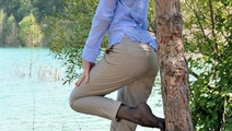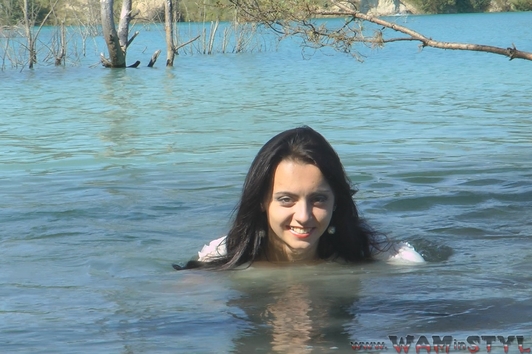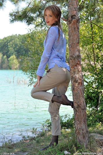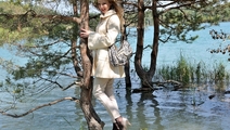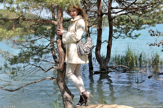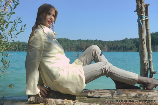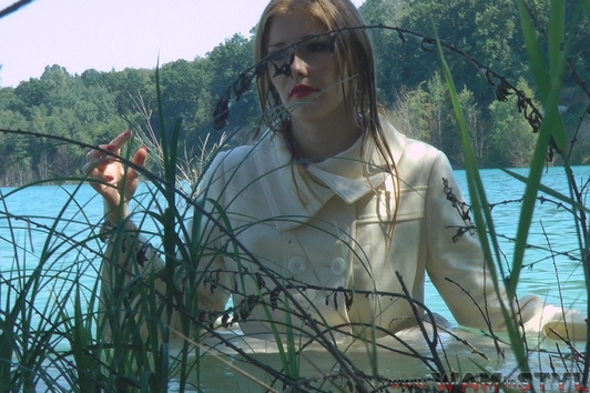 Nika in elegant white coat and trousers gets wet in the lake fully clothed. She also wears shirt, black stockings and high heel shoes under coat.