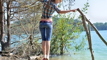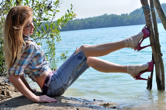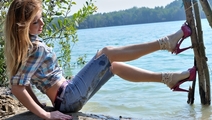 Elena in jeans shows a striptease in the lake.