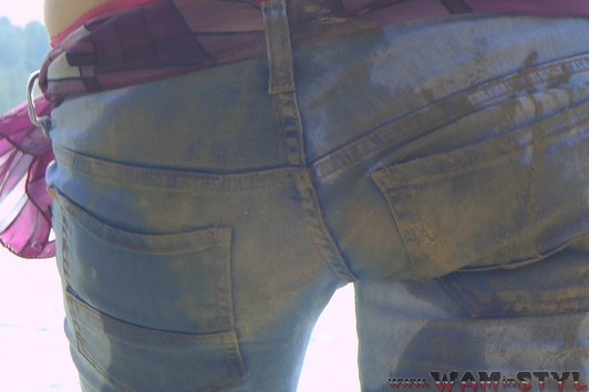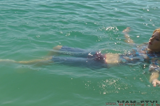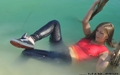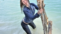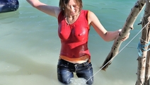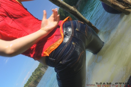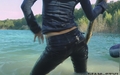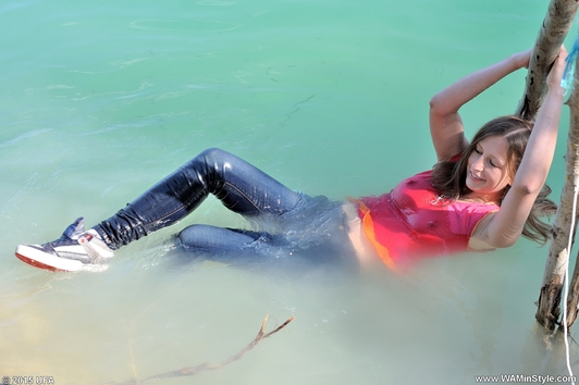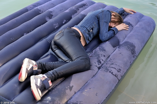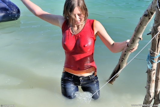 In a nice hot summer day Elena relaxes in the lake, she gets wet fully dressed in her favorite jeans and a red t-shirt, braless. Girl is dancing striptease with the music right in the water near the makeshift wooden pole. Elena all wet, dressed and looks much sexier than a nude girl. When Elena got a little tired and felt cold, she dressed a denim jacket and decided to take a rest right in the water, on an inflatable mattress.