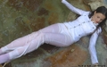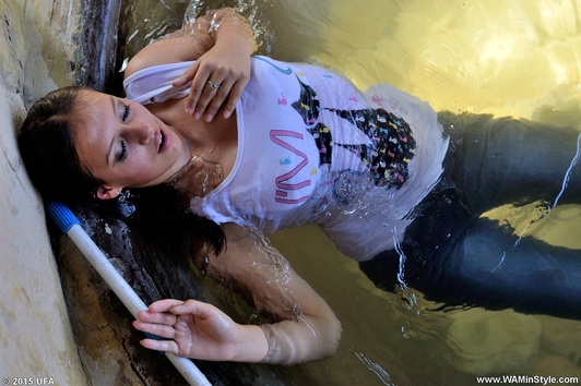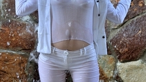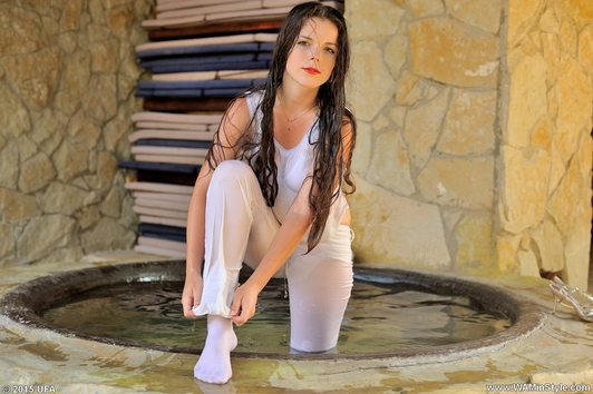 Greta in a beautiful pantsuit goes into the water of artificial waterfall. Girl gets wet fully clothed under cold jets of waterfall, then goes to worm up in the hot bowl, posing at the camera, showing a very sexy wet T-shirt and feet in wet white socks.