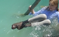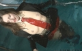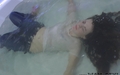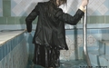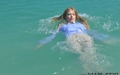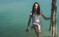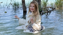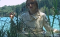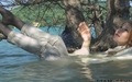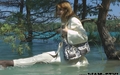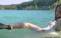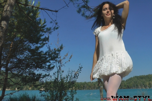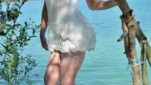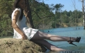 Margaret poses and bathes in the lake fully clothed, in a short white dress, stockings and high heel sandals.