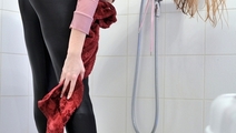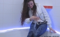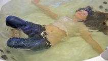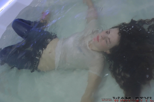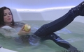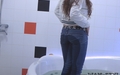 Greta decided to take a bath fully clothed. She went into the tub full of hot water, wearing tight blue jeans, light jacket and patent leather boots with high heels. At the end she took off her jacket and shoes showing us a wet white T-shirt and light nylon socks.