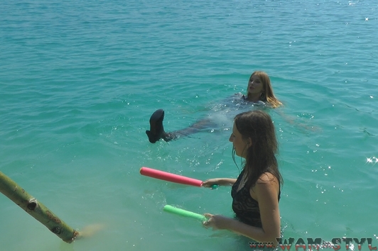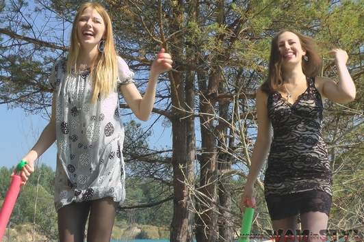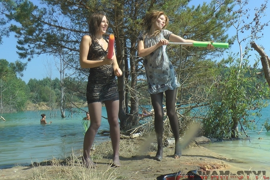Elena and Nika found an interesting wet fun, they dressed nice short dresses with stockings and high heels and had a water fight with the "Jedi swords" shooting water. Gradually, the game moved from the shores to the lake water, where girls swam enough undressing and taking off only shoes. And at the end the girls staged a wet dance in spite of admiring glances of other resting, not being embarrassed of their sexual wet views - wetlook!