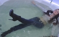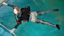 Elena swims in the pool in her most expensive business suit, she also wears black stockings with suspender and high heels shoes. When Elena is completely wet, you can see her beautiful body through the wet satin blouse.