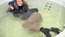 You can not imagine how it is wonderful to come home from the cold outside and immediately to get and lie in a warm bath, and not just so, but fully clothed and shod! And here is Vanessa, fully clothes, in coat, high heel boots, trousers, taking a bath, not being confused, but on the contrary - getting unearthly pleasure).