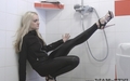 Irma decided to take a shower fully clothed. The girl went into the shower wearing black leggings, nylon socks, high heel sandals, blouse and jacket. Irma took a relaxing shower, washed her leggings right on herself, towel off her wet clothed body.