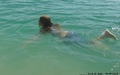 Nika swims in the lake fully clothed.