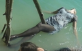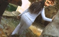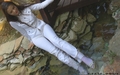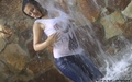 Greta in white suit gets wet under the waterfall.