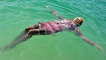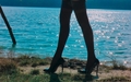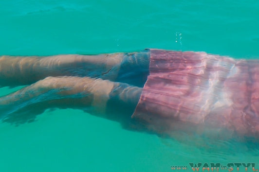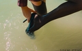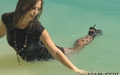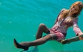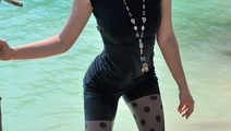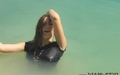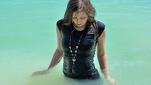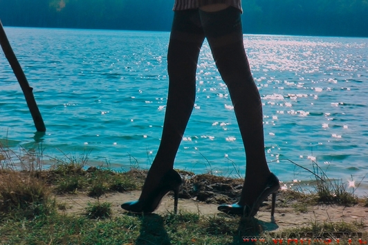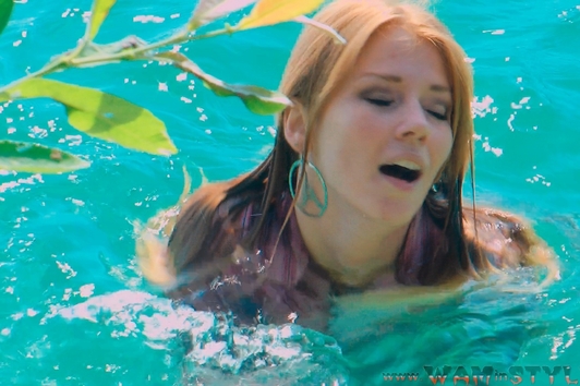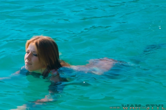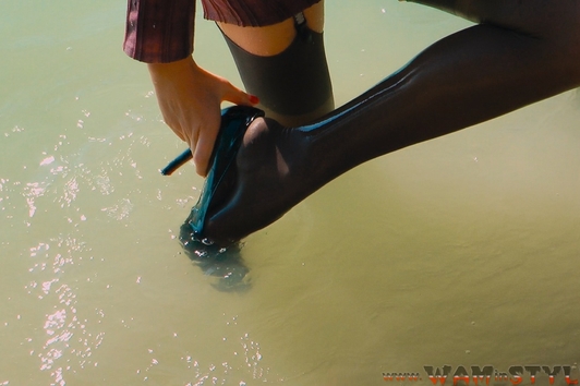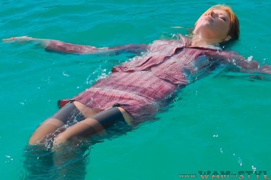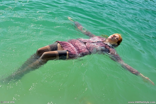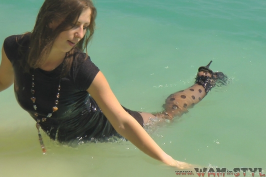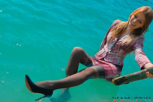 Real lady is always and everywhere a lady: during dinner, during work in the office, and ... of course during swimming on the beach. Who said that it's not a suit for swimming? Nika proves you the opposite, she swims in whatever she likes, undressed: in a skirt suit, high heel shoes and sexy stockings, and she looks in wet clothes even more magnificent than in dry.
